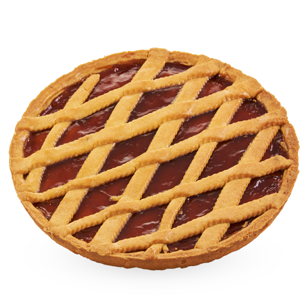 Crostata rotonda di pasta frolla farcita con confettura di albicocca.